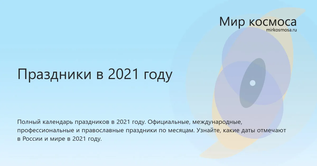 На этой странице собран календарь праздников на 2021 год с разбивкой по месяцам, типам и ключевым датам. В 2021 году в календаре представлено 486 праздников, включая 19 официальных праздничных дней.