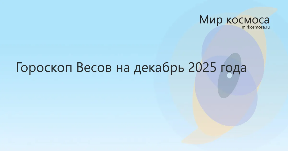 Гороскоп для Весов на декабрь 2025 года расскажет, что ждет Весов в отношениях, семье, карьере и работе, что будет со здоровьем. На данной странице представлен общий гороскоп для Весов, который даст вам несколько подсказок, чтобы вы смогли повлиять на свою жизнь.