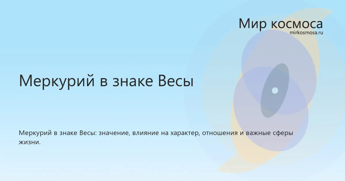 Меркурий в знаке Весы показывает, как качества планеты раскрываются в энергии этого знака зодиака и на какие сферы жизни влияние ощущается сильнее всего. На странице собраны описание значения, возможные проявления в характере, отношениях и делах, а также удобная навигация по другим знакам и планетам.