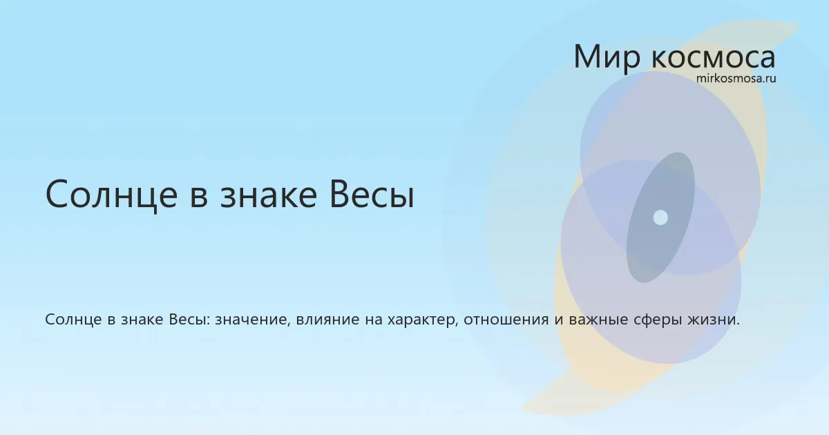 Солнце в знаке Весы показывает, как качества планеты раскрываются в энергии этого знака зодиака и на какие сферы жизни влияние ощущается сильнее всего. На странице собраны описание значения, возможные проявления в характере, отношениях и делах, а также удобная навигация по другим знакам и планетам.