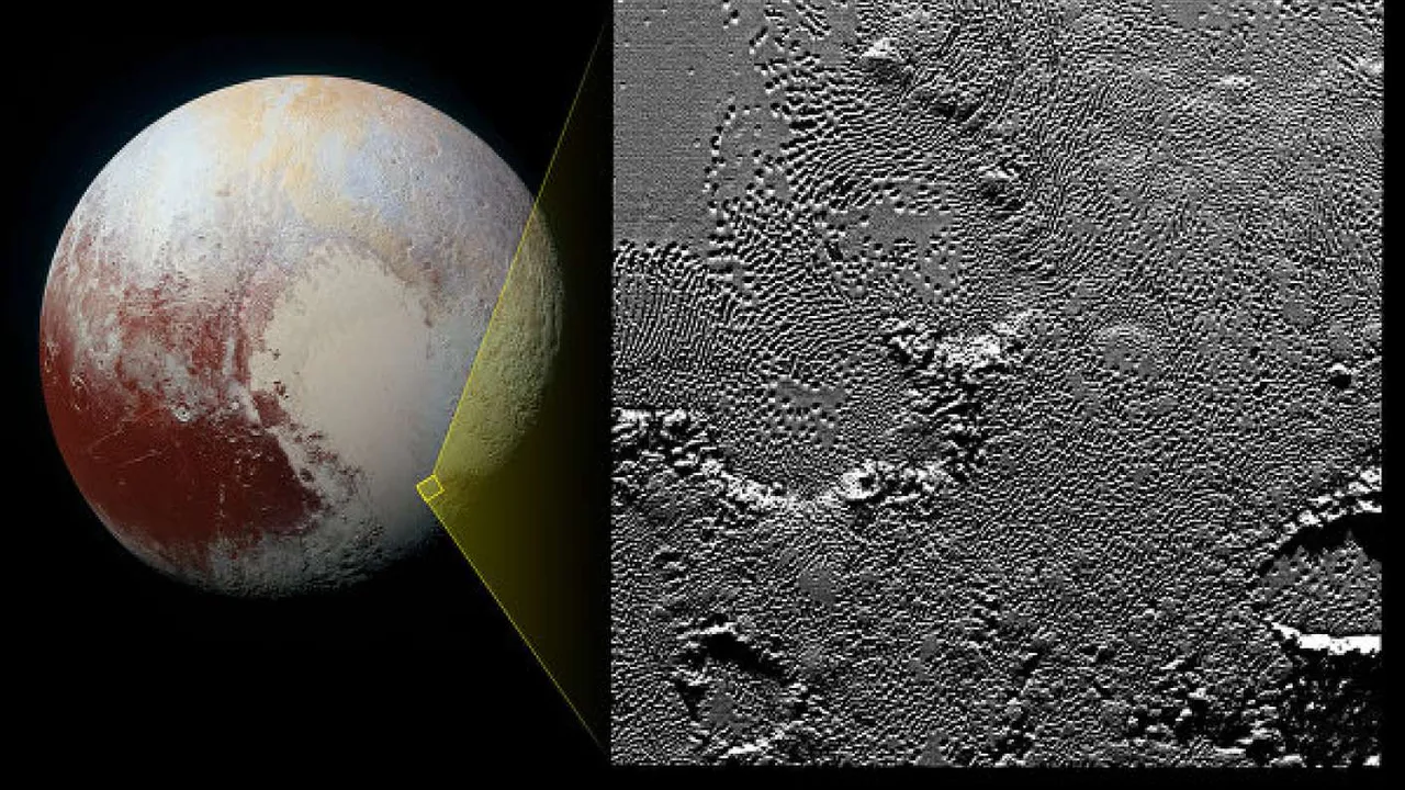 Изображение произвел зонд «Новые Горизонты» 14.07.15. Ландшафт «планеты-карлика» давно привлекает ученых, так как является слишком многогранным. В районе с неофициальным именем «Tombaugh Regio» имеются странные углубления в ледяных пластах. Они сравнительно небольшие по размеру, размещены близко друг к другу. Астрофизики считают, что такие углубления появились на плутоновской поверхности недавно. В обратном случае, они не могли бы сохраниться такими четкими и заметными.