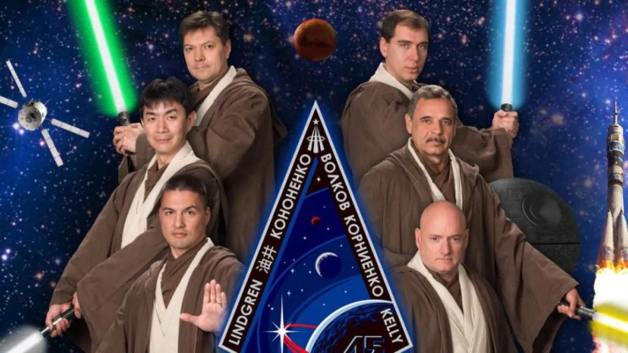 Будущая экспедиция, которая отправиться на МКС осенью этого года, уже сфотографировалась для постера в легендарном образе джедаев из саги «Звездные войны». Все космонавты одеты в коричневые балахоны и держат в руках световой меч. На заднем фоне видна МКС-цель полета.