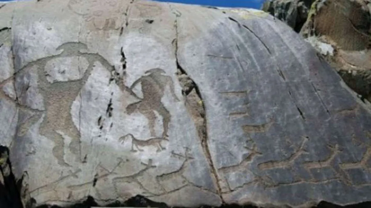 - Эпоха древних тюрков (7-10 века н. э.). Здесь стоит отметить рисунки сцен охоты, изображения медведей и быков. Здесь уже возникают древние руны тюрков.