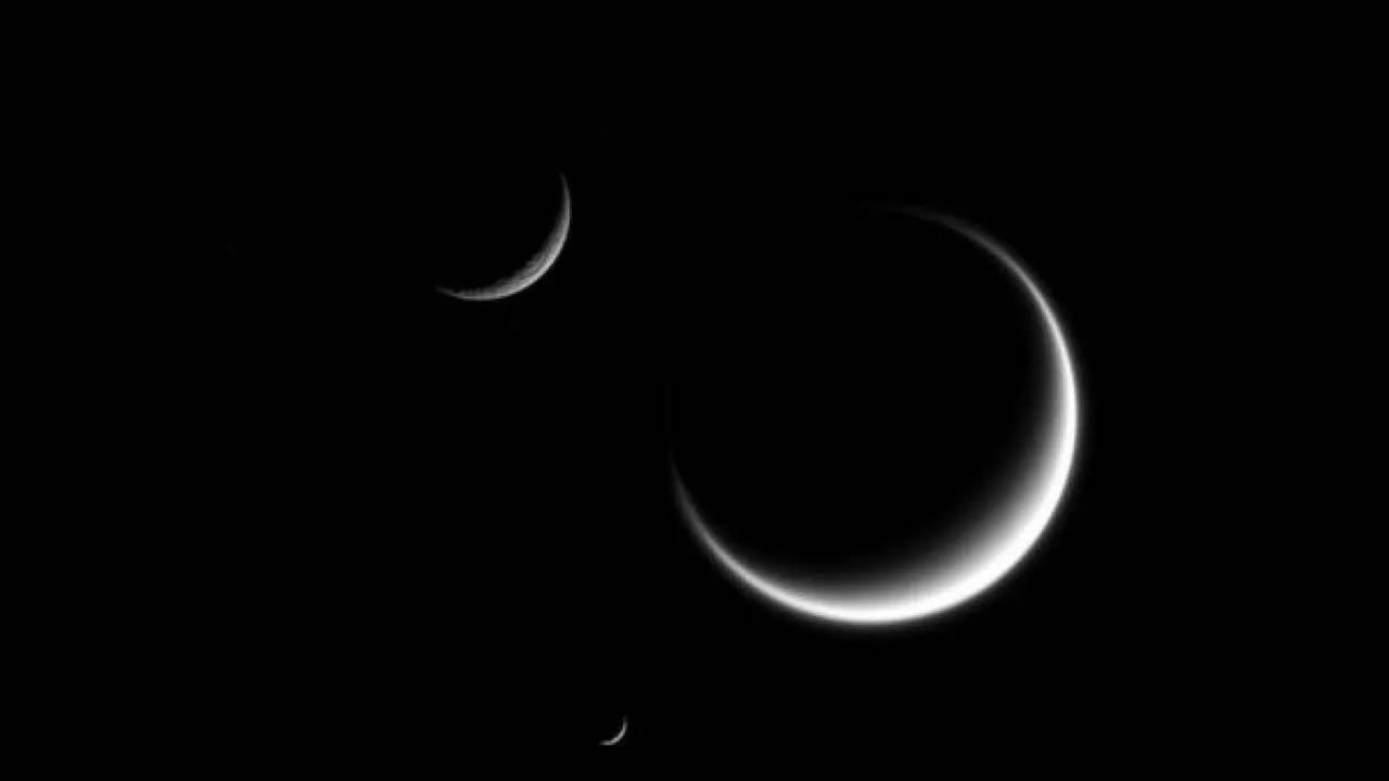 Если рассматривать, то самый большой полумесяц на фото — это Титан. Данный спутник был запечатлен космическим аппаратом с расстояния 2 млн км. Второй по величине полумесяц — это Рея, которая была сфотографирована с расстояния 3,5 млн км. Маленьким полумесяцем является Мимас. Его фото было сделано с расстояния в 3,1 млн км.