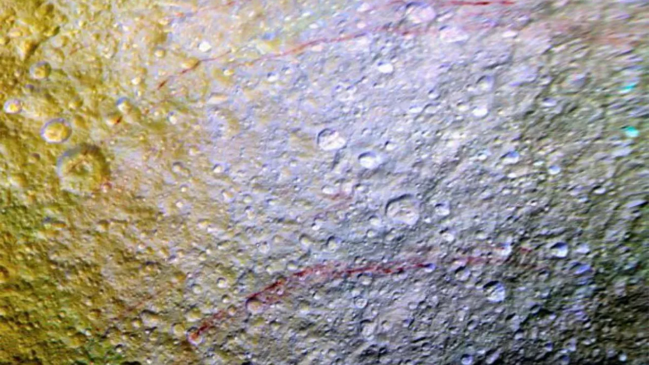 На поверхности спутника Сатурна Тефии ученые увидели необычные арочные следы кроваво-красного цвета