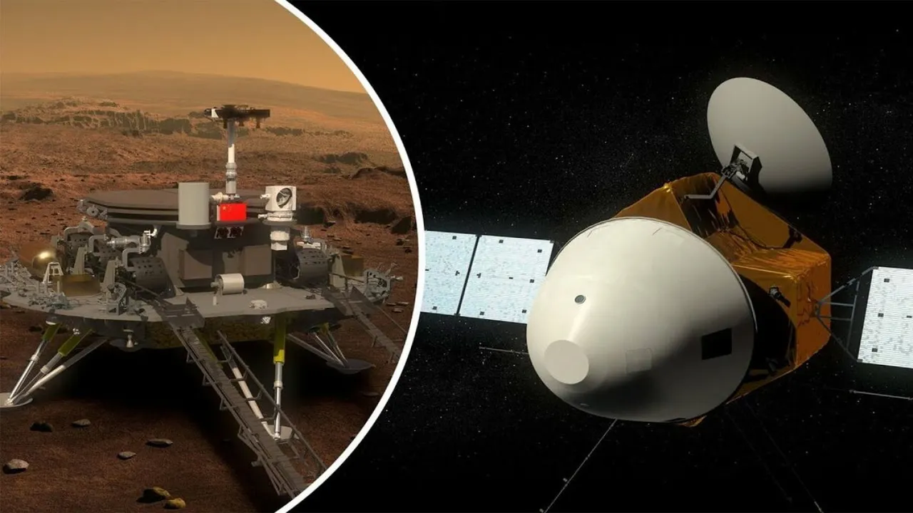 Китайские специалисты смогли сфотографировать свой марсоход «Тяньвэнь-1» в открытом космосе. На данный момент он находится на расстоянии более 23 млн км от Земли. Для получения этих кадров была использована сбрасываемая камера с двумя широкоугольными объективами. На фото мы можем увидеть посадочный модуль серебристого цвета и зонд золотистого цвета с изображением флага Китая.