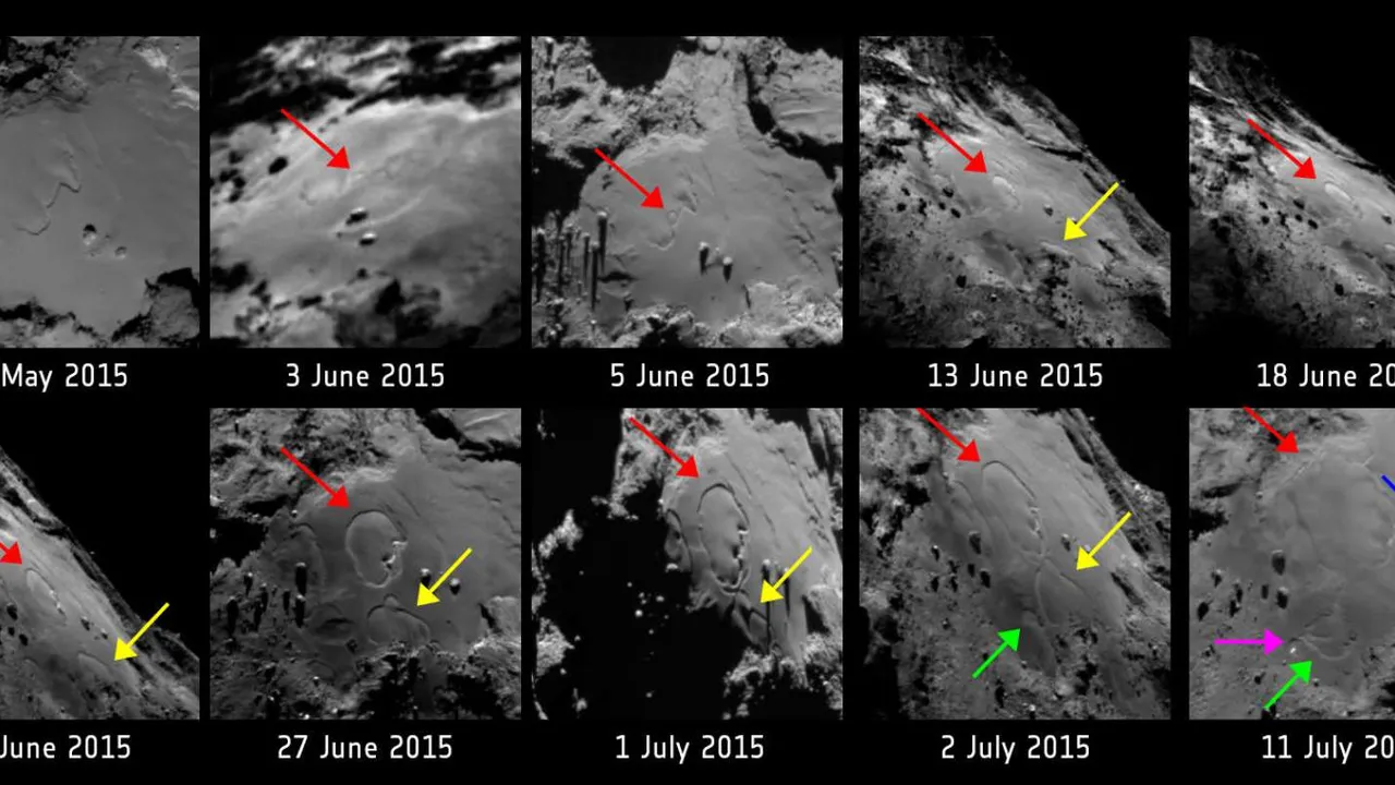 Недавно в области «Имхотеп» на комете «Чурюмова-Герасименко» появилась странная круглая форма рельефа, которой ранее там не было. Ее заметили 3 июня, а немного позже данное образование начало разрастаться. Внезапно к этой рельефной форме добавилась еще одна, практически идеально круглая. Ко второму июля данные новообразования достигли следующих размеров: 220 м и 140 м. После этого возле новых рельефных форм появилась еще одна аналогичная.