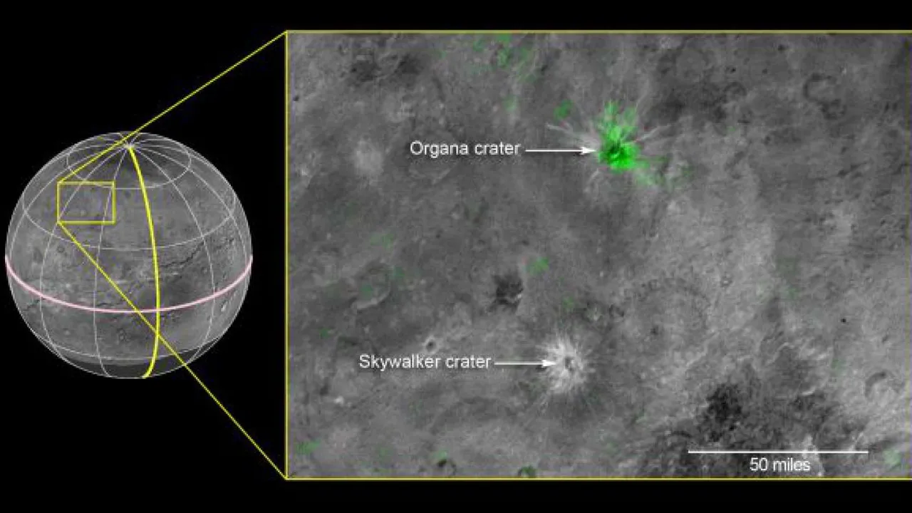 На фотографии можно видеть оба кратера. Отмеченный зеленым кратер — это «Органа», а не отмеченный — «Скайуокер». К слову, содержащийся в «Органе» аммиак может служить антифризом — обеспечивать криовулканизм спутника Плутона.